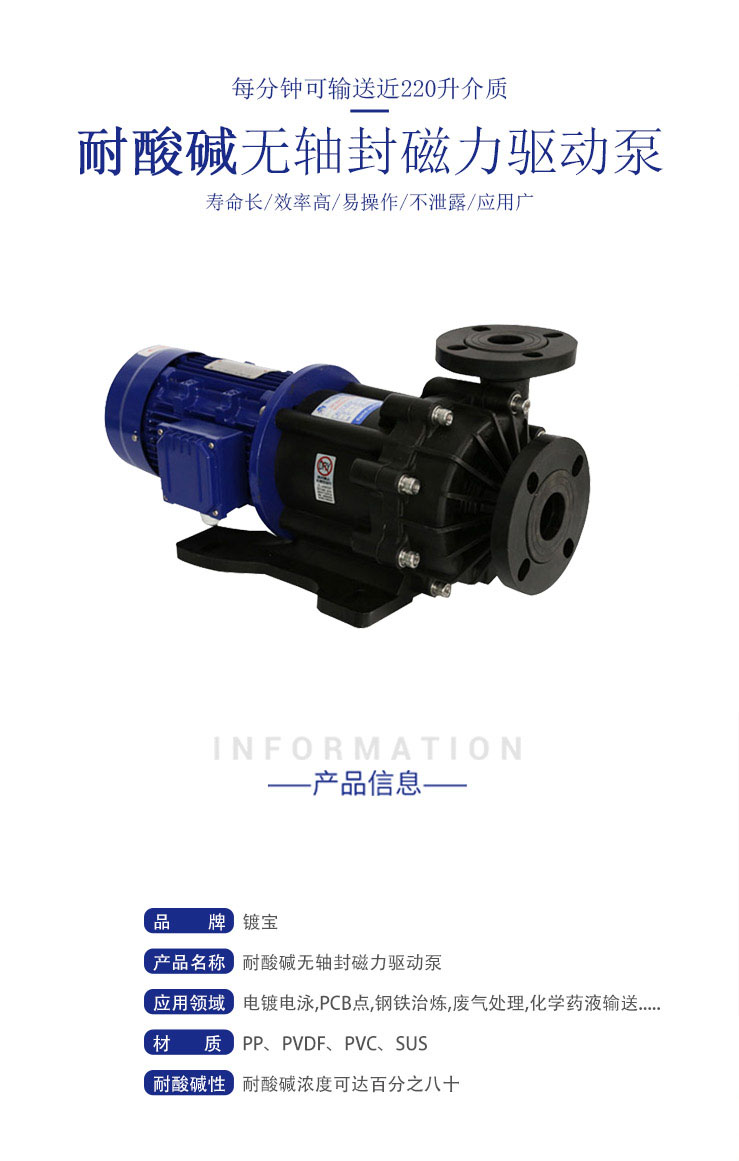 MDH的泵殼,葉輪和磁囊以聚丙烯塑料制成, MDH- P的這些部件采用氟塑料、其他接觸液體的部件由高耐腐蝕材料,如碳、陶瓷等制成,可輸送各類型的酸堿化學液體。
