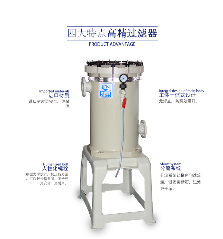 1、本過濾器上下主體均采用特厚PP板制作而成,濾桶可選用PP、PVC及亞克力制作,具有耐高壓、耐腐蝕之特性。
